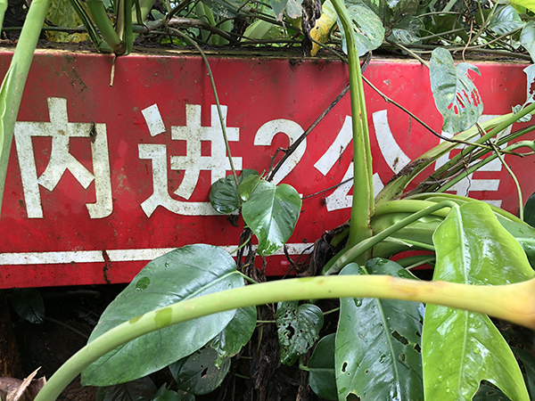 道路兩側大多數都是果蔬基地、園藝樹苗基地,依稀還有幾個擺攤賣給過路遊客水果的小販。根據導航顯示,車輛拐進了一條泥濘小路,沿着小路開了約3公里之後,看到一塊豎立的牌子上寫着“羅牛山六萬頭機械化豬場”,底端被草木遮擋住處有“內進2公里”的字樣,但再往裏深入也只剩下廢棄的豬圈,已經沒有一頭生豬了。