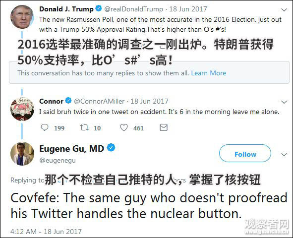 尤金·顧(Eugene Gu),範德比爾特大學醫學中心的普通外科醫生,Ganogen研究所的首席執行官。批評特朗普推特錯別字,是要罰總統漢堡包嗎?哼,休想,拉黑你。