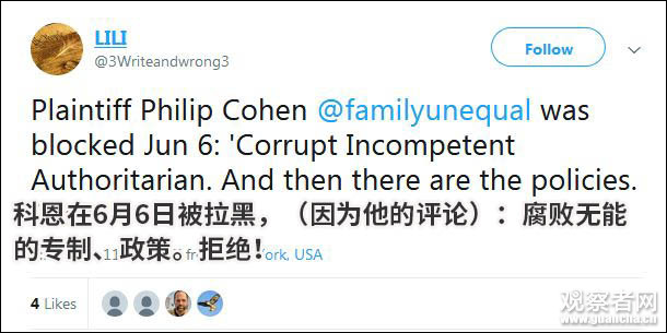 特朗普不能打壓這些回覆。屏蔽詆譭者這一舉動,不僅僅是忽視他們的評論,更是限制了他們獨立説話的權利,是對他們言論自由權利的侵犯。