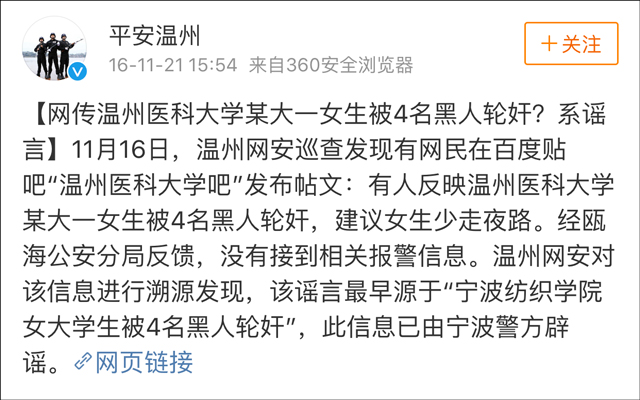 2016年11月16日,温州網安巡查發現有網民在百度貼吧“温州醫科大學吧”發佈帖文:有人反映温州醫科大學某大一女生被4名黑人輪姦,建議女生少走夜路。