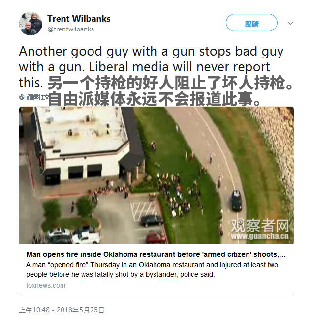 有人説:“另一個持槍的好人阻止了壞人持槍。自由派媒體永遠不會報道此事。”