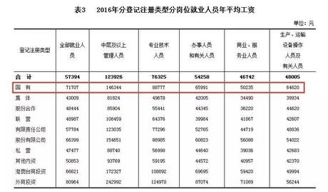 當前,國企一線職工工資普遍不高。根據國家統計局2017年5月發佈的2016年分登記註冊類型分崗位就業人員年平均工資顯示,當年國企辦事人員和有關人員、商業服務業人員、生產運輸設備操作人員及有關人員等處在一線崗位的國企職工年平均工資分別為65991、50235、64620元。