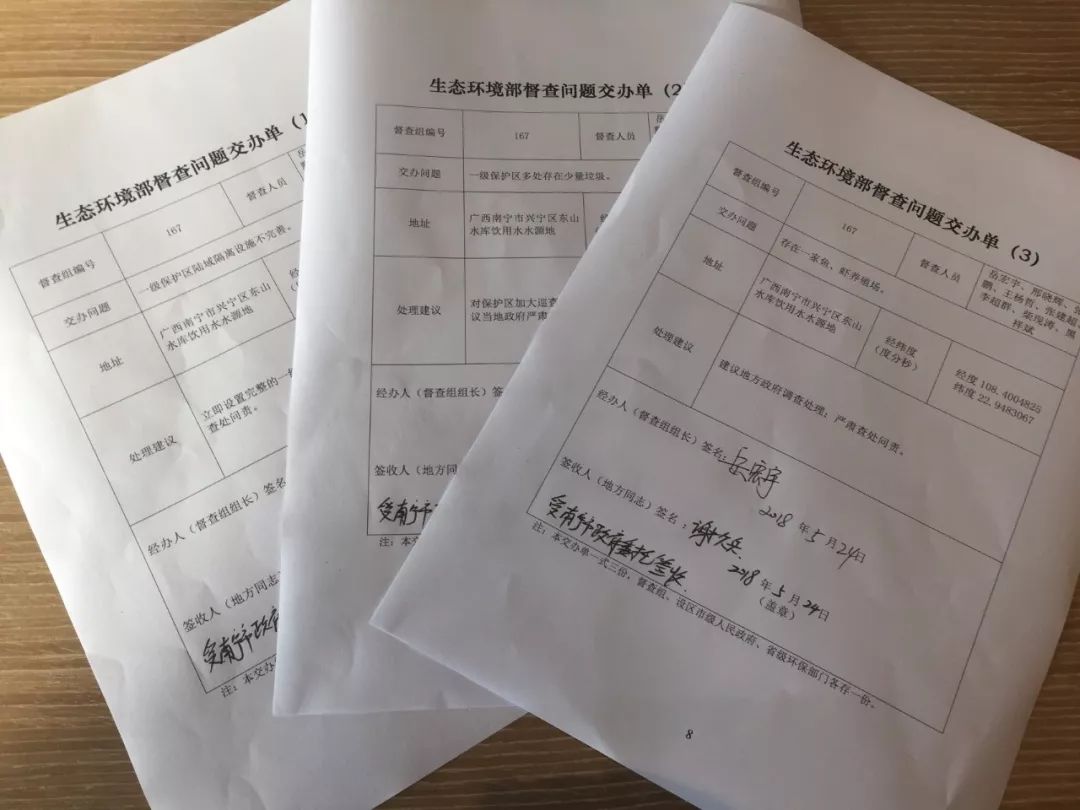 在瞭解到工廠並沒有相關手續後,督查組便向當地政府下發了《生態環境部督查問題交辦單》,交辦的問題是“新發現木材加工廠”,處理建議為“關閉或搬遷”,簽收人是南寧市環境監察支隊支隊長謝久兵,他是“受南寧市政府委託簽收”。