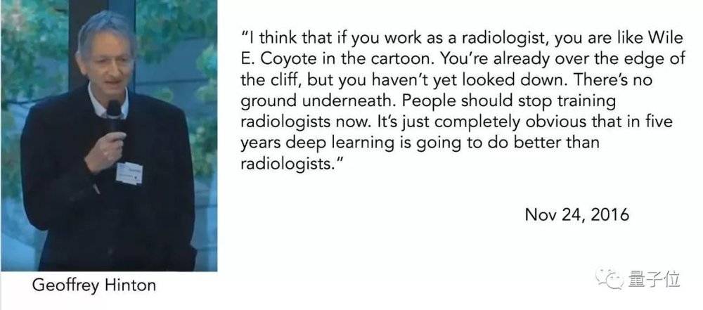 此前,聲名煊赫的Geoffrey Hinton曾經放言:從現在開始,應該停止培訓放射科醫師。他預言5-10年內深度學習就將取代這些崗位。