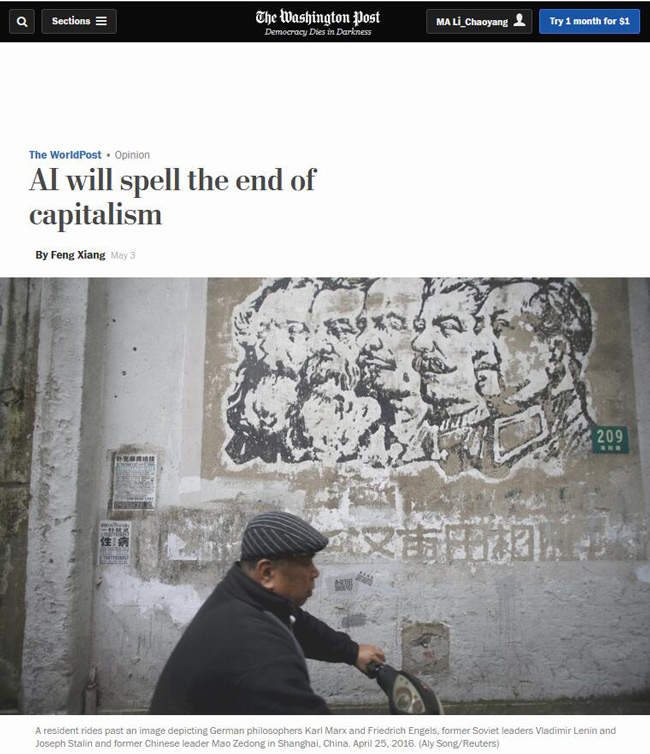 清華大學梅汝璈法學講席教授馮象2018年5月3日在美國《華盛頓郵報》網站刊發文章:《人工智能的崛起將敲響資本主義的喪鐘》