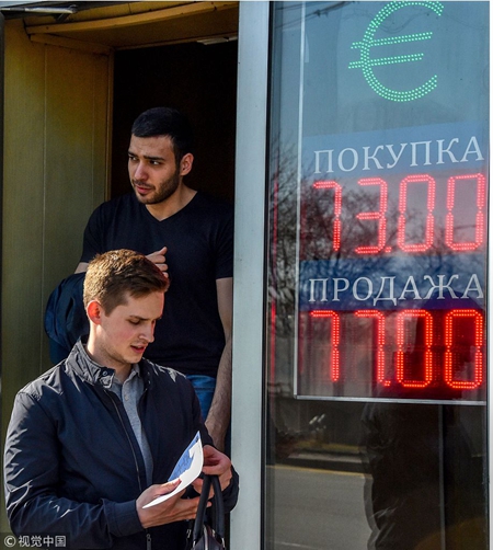 當地時間2018年4月10日,俄羅斯莫斯科,匯率信息。受到美國製裁、敍利亞局勢惡化等影響,俄羅斯金融市場昨天遭到“血洗”——盧布創兩年來最大的單日跌幅;兩大股票指數暴跌(@視覺中國)