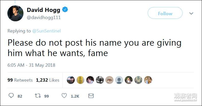 同樣,槍擊案倖存者、如今美國控槍運動學生領袖大衞·霍格(David Hogg)發推支持帕洛克的説法:“請不要散佈這則視頻,不要讓科魯茲得逞,他就想要博關注。”
