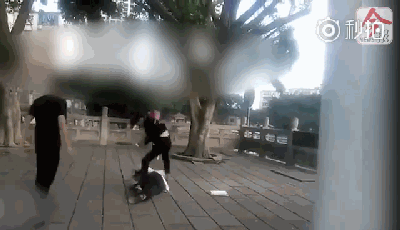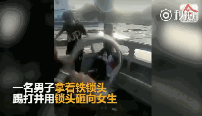 視頻中兩名黑衣男子正在猛烈踢打一名身着紅白相間校服的女生,其中一名男子還拿着鐵鎖頭多次瘋狂的砸向倒地女生。