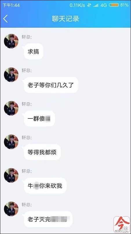 網傳畫面中打人者和被打者都是未成年學生,據南國今報消息,微信羣還傳出了網友人肉打人者的截圖,截圖中顯示打人者之一自稱“軒總”,該軒總還在qq聊天記錄中叫囂挑釁“老子滅完XXX”“牛X你來砍我”。