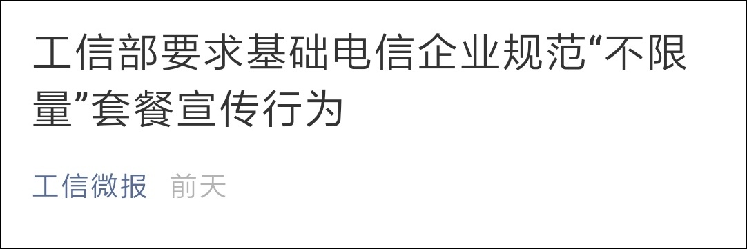 9日,工信部官方微信公眾號“工信微報”發佈,6月7日,針對基礎電信企業“不限量”套餐隱藏限制條款等宣傳問題,工業和信息化部相關司局組織召開會議,明確提出有關要求: