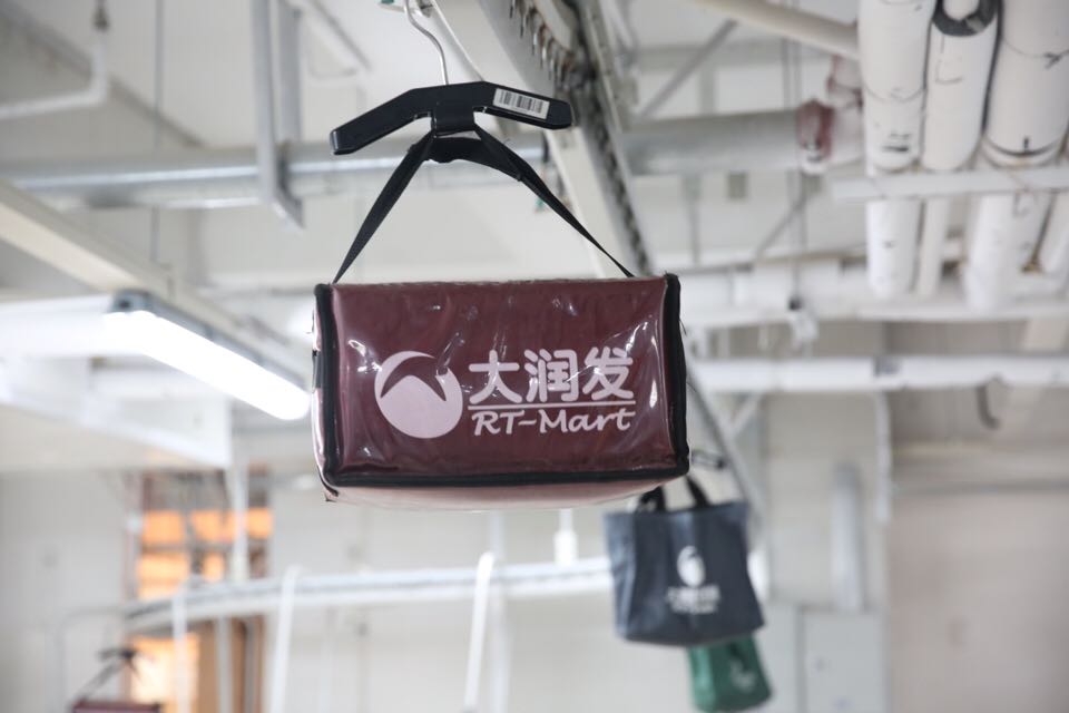大潤發懸掛鏈改造,紅色包裝袋為熟食,灰色包裝袋為生鮮冷物,綠色包裝袋為常温商品 大潤發供圖