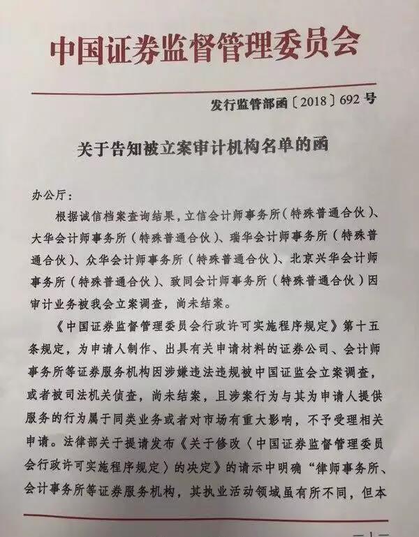 “立信、瑞華、大華、眾華、興華、致同6家會計事務所的材料證監會發行部和市場部都不收了,是以5月28日為界限,已經報了材料的,要不就撤回材料,要不就是不給受理函,補正材料也沒用”,業內人士透露道。