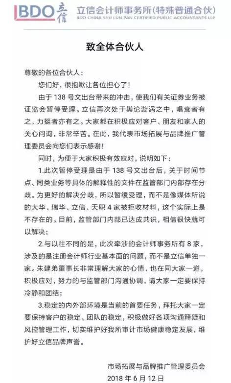 那麼,到底為何被暫停業務呢?立信回應稱,此次暫停受理主要是由於138號令出台後,關於時間節點、同類業務等具體的解釋下文件存在分歧,為更好地解決分歧,所以暫緩受理,而不是拒收材料,這並不存在。目前監管部門內部已達成共識,相信很快就可以解決。此外,也有業內人士向火山君出示了相關函,更確認了該事件緣起138號令。