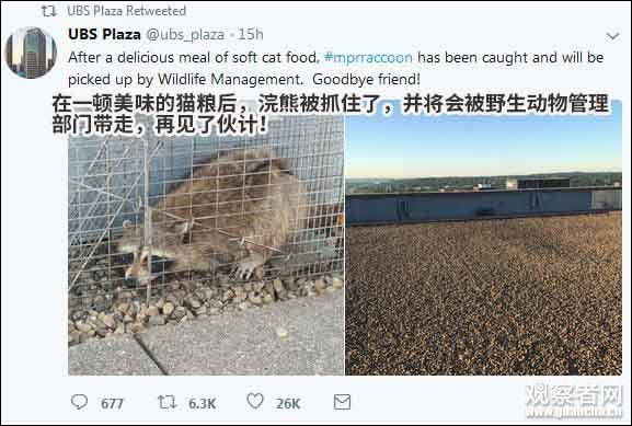 據《華盛頓郵報》報道,這隻浣熊一開始被困在瑞銀大廈隔壁的一幢樓,沒東西吃也沒水喝。它可能受到了驚嚇,而它似乎相信逃離危險的最好方法就是往上爬。