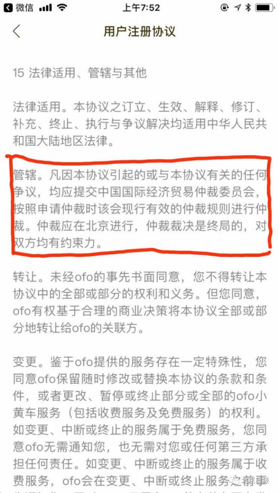 據微信公眾號“北京日報”(ID:Beijing_Daily)6月16日消息,註冊ofo,可得注意用户註冊協議第15條,否則,發生糾紛,法院都管不了。