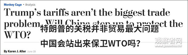 美國西北大學政治科學與法律教授,巴菲特研究所全球資本主義和法律研究小組成員凱倫·阿爾特(Karen J. Alter)6月18日在《華盛頓郵報》撰文提出,WTO正逐漸變得無足輕重,既然中國從WTO獲益匪淺,他們是否會站出來成為WTO的捍衞者?