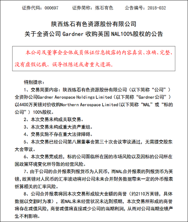 這項收購中的買家加德納航空,是一家總部位於英國德比的航空零件供應商,規模大於北方航空。去年6月,中國上市公司陝西煉石有色資源股份有限公司(煉石有色)在倫敦宣佈,以3.26億英鎊(約28億人民幣)完成對加德納航空控股有限公司的併購。