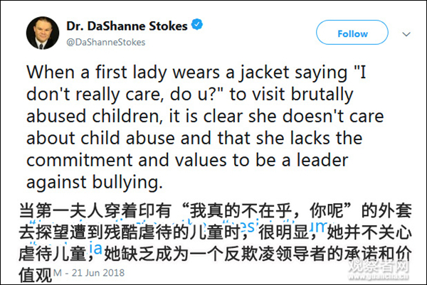 她還在推特上打出“她在乎(She Cares)”、“Its Just A Jacket(這只是件外套)”標籤,表示:今天在得州對孩子們的訪問,對第一夫人影響很大,如果媒體把時間和精力放在幫助孩子,而不是猜測和關注第一夫人的衣櫃上,我們可以為孩子們做更多。