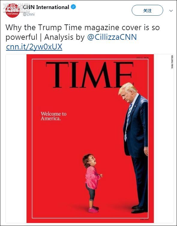 當地時間21日公佈的最新一期《時代》週刊用哭泣的小女孩面對高大的特朗普做封面,並配以“歡迎來到美國”,諷刺十足。在內文,《時代》表示小女孩因為被帶離媽媽身邊而大哭。