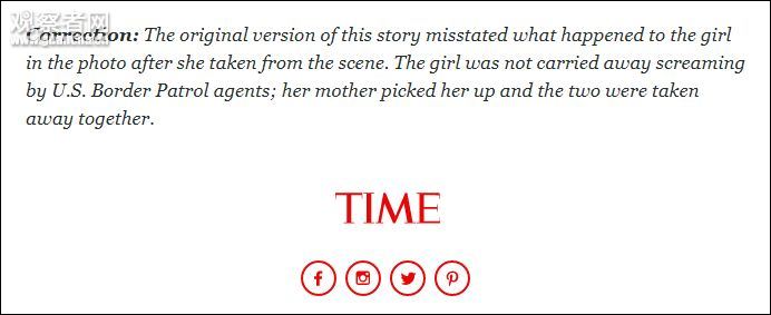 《時代》更正了報道內容:“這個故事的最初版本錯誤地描述了照片背後的故事。這個小女孩並不是哭着被美國邊境巡邏隊帶走的,她的媽媽後來抱起了她,倆人一起離開了。”