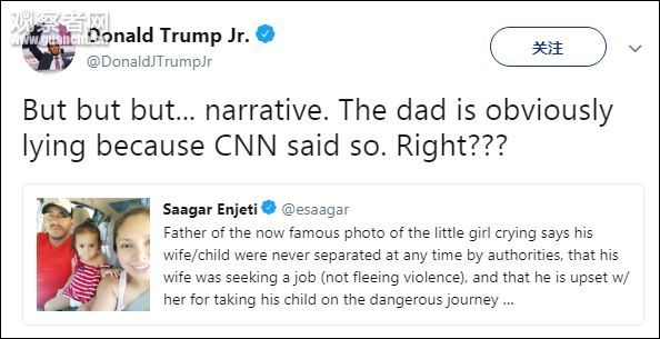 眼看着媒體們就要贏了,命運卻送給特朗普一份“大禮”:在《時代》公佈封面幾小時後,小女孩的爸爸就向媒體表示,女孩沒有與媽媽分開。