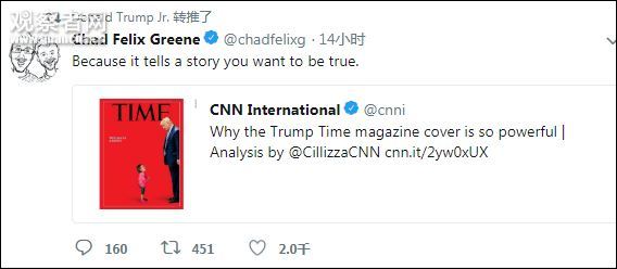 小特朗普轉推了一條對CNN的諷刺帖子:“因為它(《時代》講了個你希望是真的的故事)。”