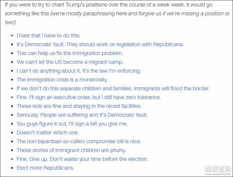 CNN仍在戰鬥,其6月22日的報道專門羅列了特朗普在近一週內對移民的態度。從“都是民主黨的錯”,到“不能把美國變成移民營”,“我什麼都做不了”,到“好吧,我籤行政命令,但仍然堅持‘零容忍’”,再到“你們想個法案,我來簽字”,最後説“好吧,放棄吧。在中期選舉前不要浪費你們的時間了”,特朗普的態度轉變的時間點的確是很微妙了。