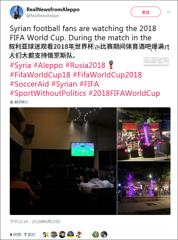 俄羅斯衞星新聞網站6月22日報道了“西方媒體不會告訴你”的阿勒頗現狀,這座飽經戰火的城市目前已經逐漸恢復活力,重建工作到處進行,孩子們能夠安全地前往古蹟參觀,市民們可以聚集在酒吧觀看世界盃,不同信仰的人也能夠自由前往清真寺和教堂參加活動。