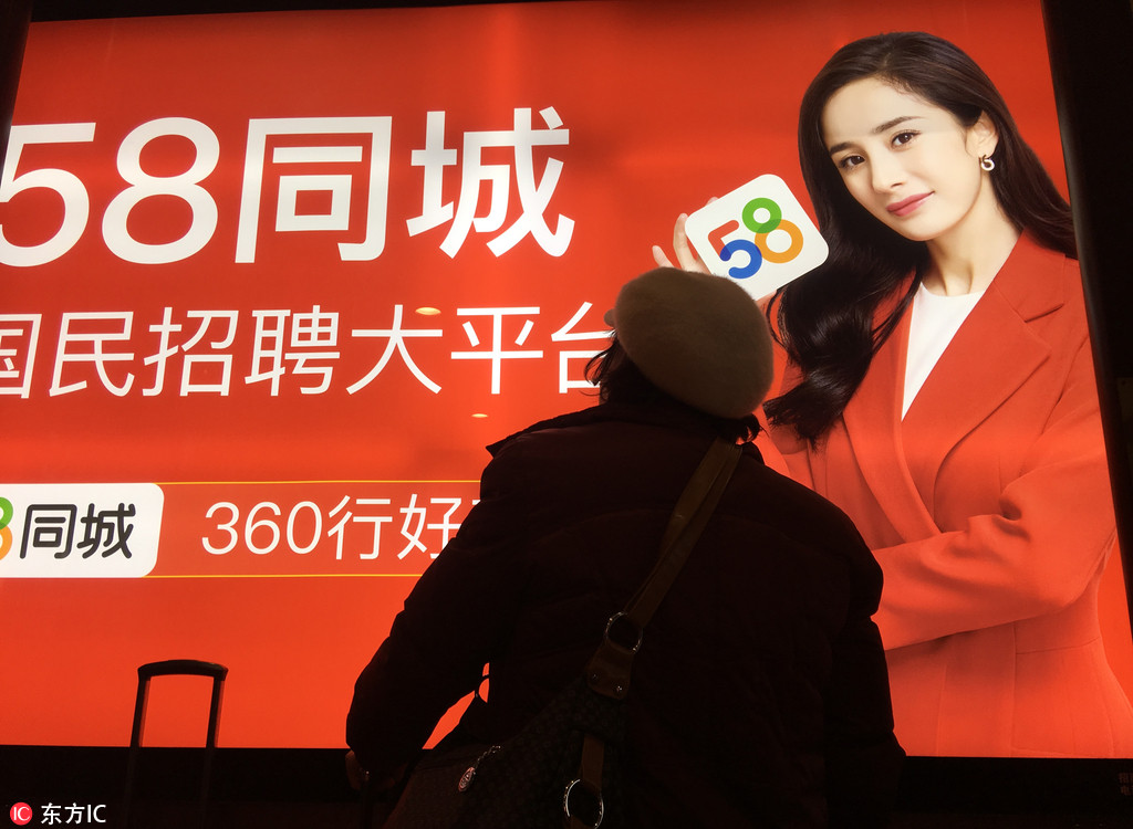 2018年3月22日,北京,一行人從58同城logo招牌下經過@東方IC