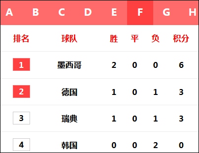 兩戰過後,韓國隊以0勝0平2負的戰績積0分在F組墊底。雖然從理論上講,如果在第三輪小組賽裏墨西哥戰勝瑞典,而韓國又能拿下德國的話,他們或許還有靠淨勝球拼出現的機會,但明眼人都清楚,面對剛剛靠一次絕殺實現重生的德國戰車,任何對韓國隊出線可能性的分析都不過是連安慰都算不上的數學遊戲。