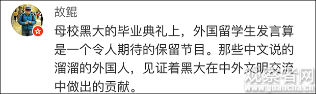 黑大學子透露,“母校黑大的畢業典禮上,外國留學生髮言算是一個令人期待的保留‘節目’。那些中文説得溜溜的外國人,見證着黑大在中外文明交流中做出的貢獻。”