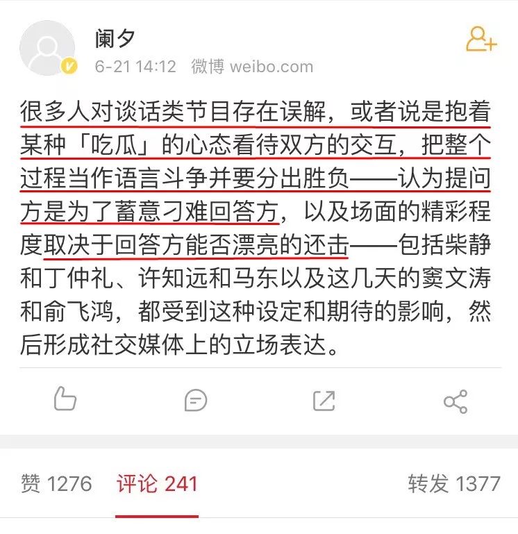 微博網友闌夕指出訪談類節目目前的一個困局,談話類節目在社交媒體上的立場表達,被一種畸形的觀念所捆綁,彷彿語言鬥爭是要分出勝負的,提問的目的是蓄意刁難對方,而回答也被賦予了反擊的期待。