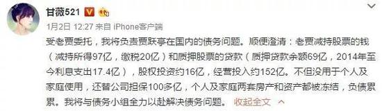 很快,賈躍亭的夫人甘薇在微博稱已經回到北京,自此開啓了“替夫還債”之路。