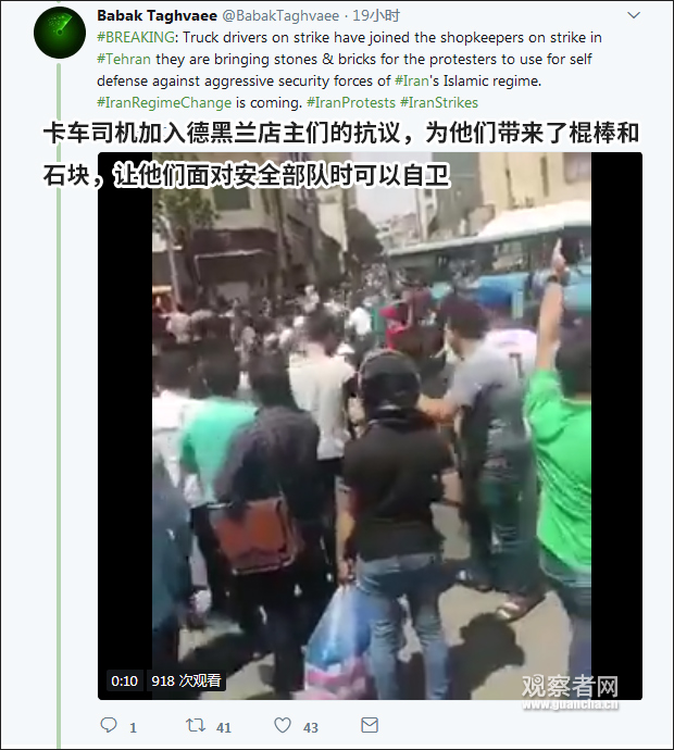 有報道稱,德黑蘭大巴扎數百名店主罷工抗議匯率混亂造成進口商品成本飛漲,不過,社交媒體上大量視頻和圖文“直播”顯示,抗議者並非僅為數百名店主,他們的訴求似乎也不侷限於經濟層面。