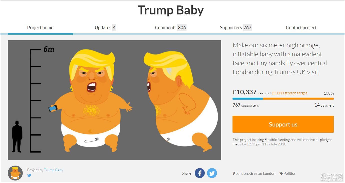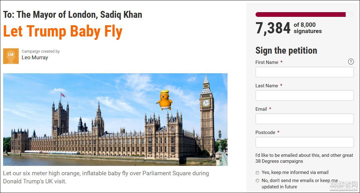 為了替寶寶實現願望,有一個專門的活動頁面,希望倫敦市長能“讓特朗普寶寶飛”,目前已有7千多人簽名。