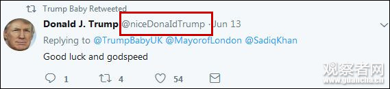 儘管賬號創建於1月,但他的第一條推特發於6月13日,轉推了“特朗普”的一條,恩,是假的“特朗普”。