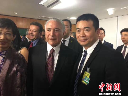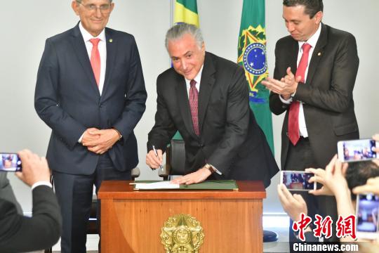 巴西總統特梅爾(中)在總統府簽署“中國移民日”法令 圖自中新網