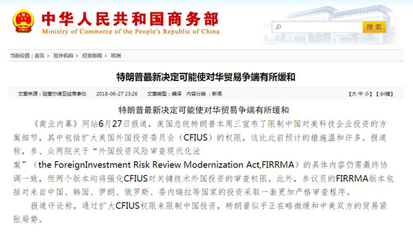 商務部網站6月27日深夜刊文稱,參議院的《外國投資風險評估現代化法》版本包括對來自中國、韓國、伊朗、俄羅斯、委內瑞拉等國家的投資採取一套更加嚴格審查程序。《商業內幕》網站評論稱,通過擴大CFIUS權限來限制中國投資,特朗普似乎正在略微緩和中美雙方的貿易緊張局勢。