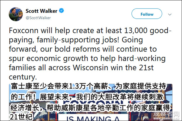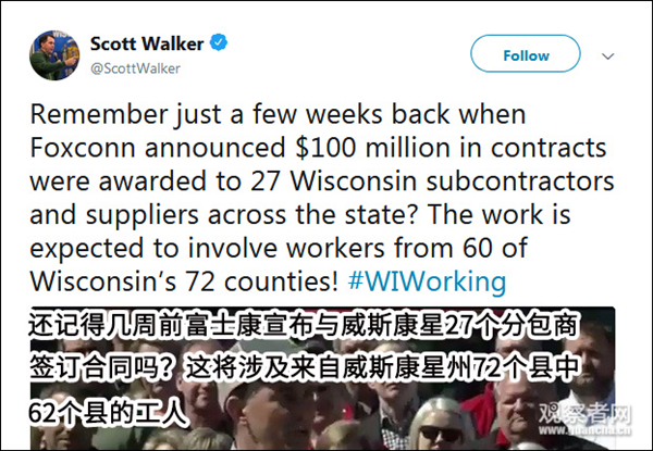 期待從富士康身上“得到好處”的不止是特朗普,共和黨籍威斯康星州長斯科特·沃克(Scott Walker)也寄希望在富士康建廠一事上獲取政治資本。