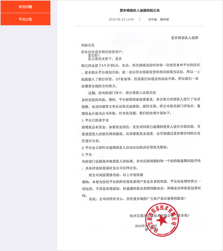 1、花果金融最新公告、債權逐漸出現逾期。短時間內無法得到控制改善。