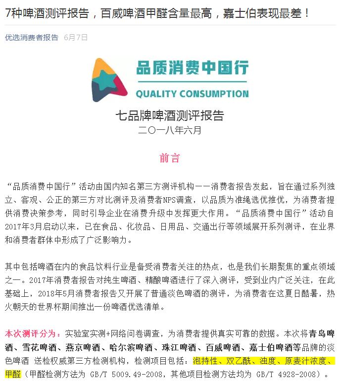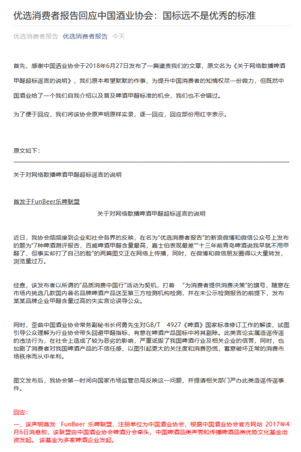 回應稱,關於啤酒國標修訂將去除甲醛報道,並非優選消費者報告首發,輕工業行業刊物《輕工質量與標準》2017年第3期曾公開報道。