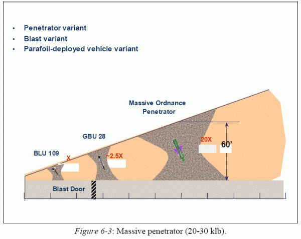 美軍目前裝備三種級別的鑽地炸彈,2000磅級的BLU-109,5000磅級的BLU-113和30000磅級的GBU-57,穿透深度從數米鋼筋混凝土到數十米水平