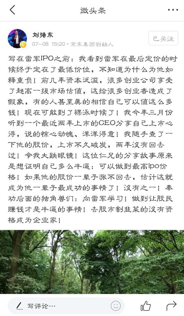 7月8日,在小米即將在香港上市的前一天,劉強東發佈狀態盛讚雷軍。他表示,前幾年資本氾濫,很多創業公司享受了超高估值,結果在上市不久股價就破發,而雷軍則將股價定在了最低價位。劉強東奉勸獨角獸們向雷軍學習:做到讓股民賺錢才是牛逼的事情!去股市割韭菜的沒有資格成為企業家!