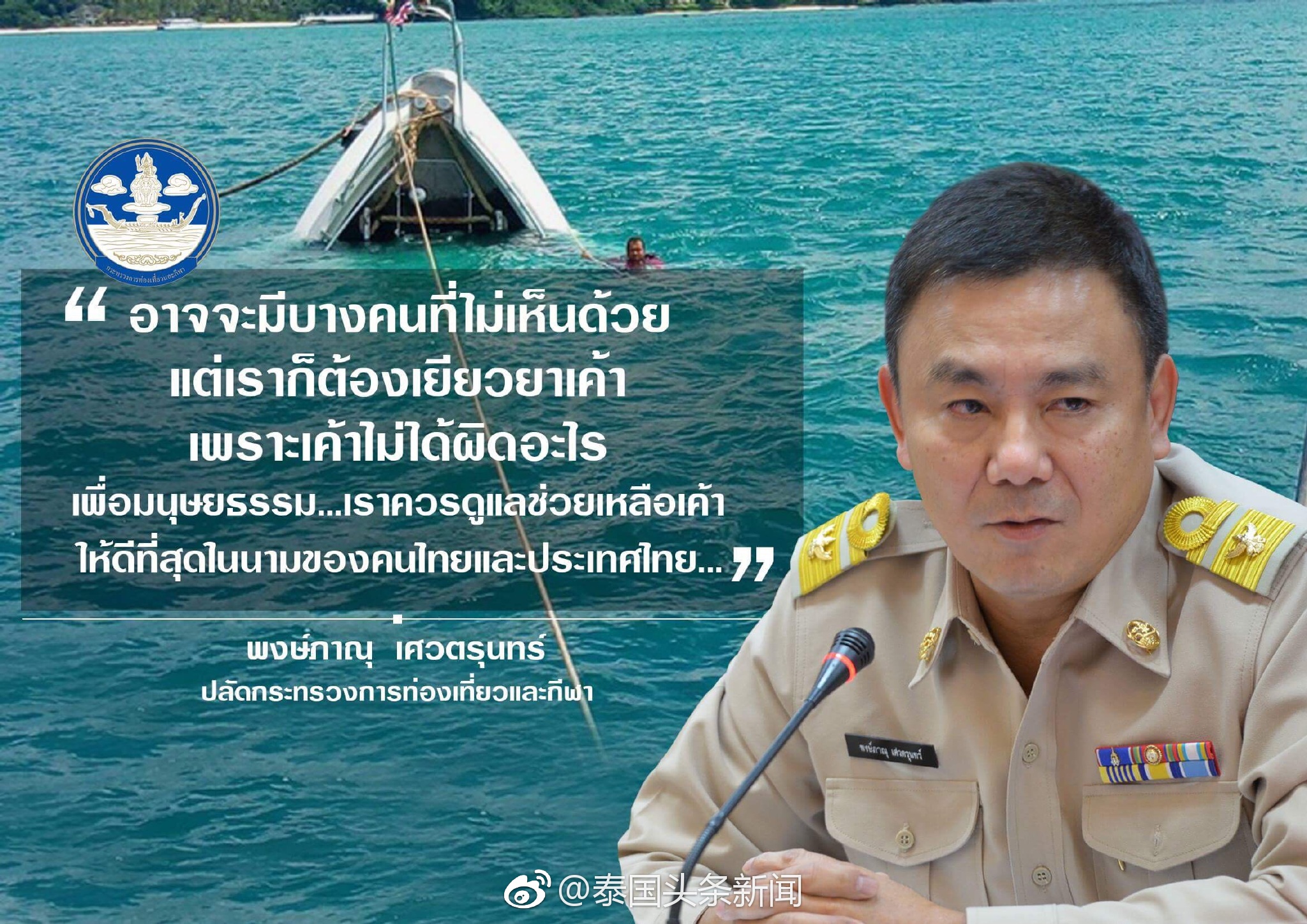 另外,泰國旅遊與體育部常務次長蓬帕努就普吉翻船事件表示:“可能有一些人不理解,但我們也要照顧他們,因為他們沒有錯。就人道主義而言,我們也要以泰國國家和人民的名義盡力幫助他們。”