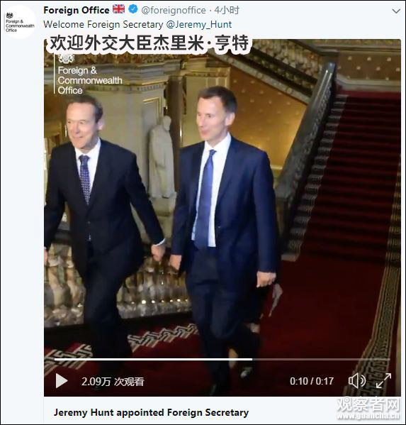 英國外交大臣半天內易人:“中國女婿”傑里米·亨特走馬上任