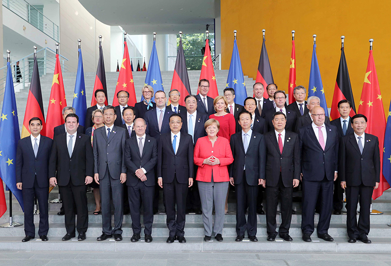 當地時間7月9日中午,國務院總理李克強在柏林總理府與德國總理默克爾共同主持第五輪中德政府磋商。這是兩國總理與出席磋商的中德雙方人員合影。新華社記者 劉衞兵 攝