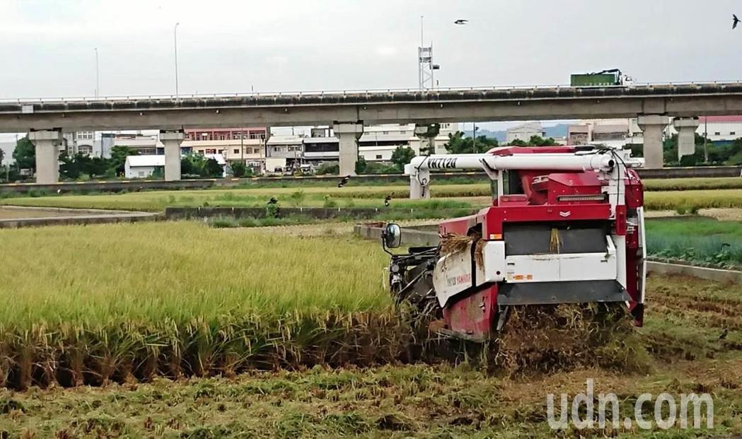 搶收稻米的收割機 若是颱風來之前沒收割完,今年台灣農民很多就白乾了,圖源:中時電子報