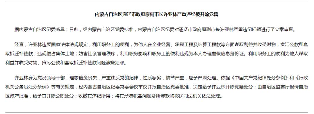 據微信公眾號“政知圈”7月10日消息,兩年半以前,2015年11月,內蒙古自治區紀委通報,許亞林因涉嫌嚴重違紀接受組織調查。2017年2月,許亞林被通報雙開。