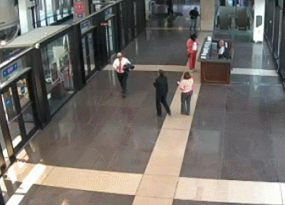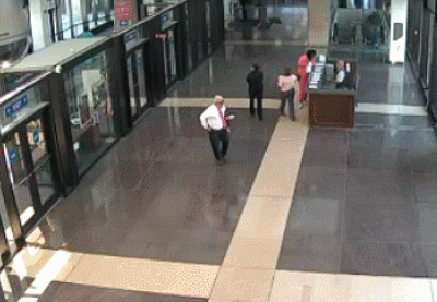事發時的監控顯示,卡萊普斯當時帶着墨鏡,外套搭在手上,與兩名女職員迎面走過。正當他舉手與兩人打招呼時,槍從他身上掉了出來。