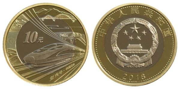 公告介紹,中國高鐵普通紀念幣正面圖案為國徽,其上方刊“中華人民共和國”國名,下方刊年號“2018”字樣;背面圖案主景為“復興號”動車組,背景為大勝關長江大橋、北京南站、“復興號·中國高鐵”文字及高山、梯田、沙漠等。主景上方刊有面額“10元”字樣。
